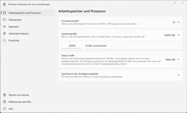 Ein Fenster öffnet sich, in dem Sie die Leistungswerte von WSL anpassen können. Viele Anwender verwirrt zunächst, dass in dieser App viele Schaltflächen grau dargestellt sind. Normalerweise bedeutet das, dass man eine Einstellung nicht bearbeiten kann. Dem ist hier jedoch nicht so. Um beispielsweise unter Arbeitsspeicher und Prozessor die Prozessoranzahl anzupassen, klicken Sie einfach neben die Zahl und ändern anschliessend den Wert wie gewünscht, Bild 15.