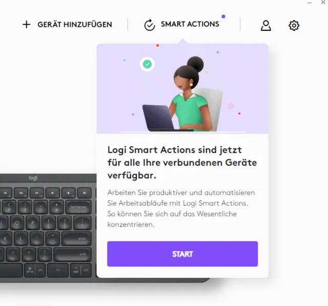 - Öffnen Sie die App Logitech Options. Wenn Sie die jüngste Version installieren, sollten Sie beim erneuten Öffnen direkt auf Smart Actions hingewiesen werden.
