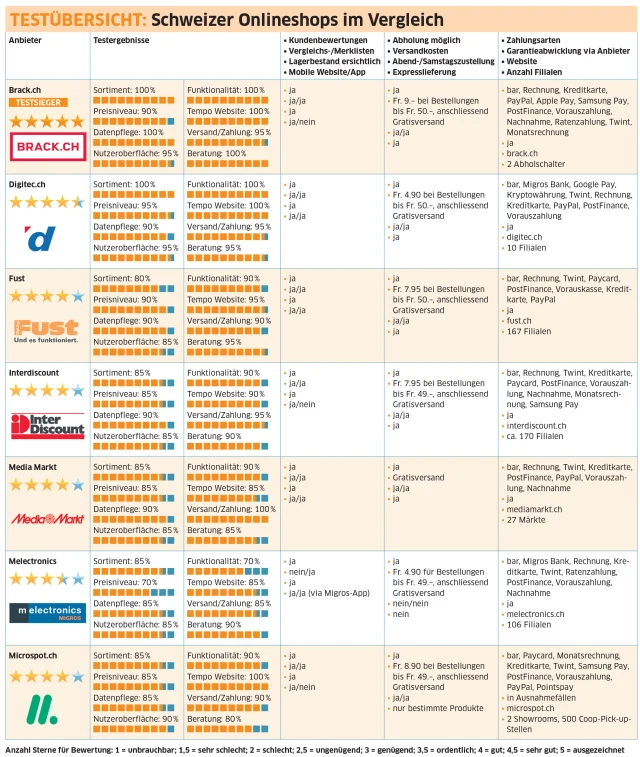 Zu den Bezahlmöglichkeiten: Alle Händler bieten gängige Methoden wie Vorauskasse, Rechnung, Kreditkarte, Twint, PostFinance oder Barzahlung (direkt im Laden, sofern vorhanden) an. Als Kreditkarten werden in der Regel Visa oder Mastercard akzeptiert. Bis auf Interdiscount und Melectronics können Käufer auch mit PayPal bezahlen. Wer gerne bar seine Rechnung begleicht: Fast alle Händler fahren zweigleisig: Digitec.ch, Fust, Interdiscount, Media Markt, Melectronics und Microspot.ch bieten zusätzlich zum Onlineshop, auch Ladengeschäfte an. Die Idee: Ein möglichst grosses Filialnetz aufzuspannen, um flächendeckend zu agieren. Brack.ch als Ausnahme bietet zwar auch einen Abholservice an, seine Produkte werden aber hauptsächlich per Paketdienst überbracht. Fust kommt auf 167 Läden, Interdiscount auf ca. 170 Filialen, der Media Markt auf 27 Geschäfte. Weitere detaillierte Informationen über die Händler, deren Onlineshops sowie zu den Versandkosten finden Sie in der Tabelle unten.