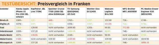 In unserem Shopvergleich haben wir acht Produktstichproben durchgeführt, um Preise und Verfügbarkeit zu vergleichen (siehe Tabelle unten). Das Ergebnis: Das Mass aller Dinge sind die Händler Brack.ch und Digitec.ch. Diese können alle unsere Produkte sofort liefern. Fust, Melectronics und Microspot.ch müssen zweimal passen, Media Markt und Interdiscount sogar dreimal.