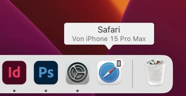 Die Funktion Handoff steht für den nahtlosen Übergang, um eine Aufgabe von einem Gerät an ein anderes zu übertragen. Als Bindeglied agiert dabei einmal mehr die Apple-ID, die auf allen Geräten dieselbe sein muss. Wenn Sie zum Beispiel am iPhone eine Website in Safari aufrufen und am Mac sitzen, taucht im Dock automatisch ein weiteres Symbol auf, mit dem die Seite mit einem Klick am Mac geöffnet wird, Bild 1. Dasselbe funktioniert mit den Kontakten und anderen Apple-Anwendungen. Und vor allem funktioniert das hervorragend mit der Zwischenablage: Kopieren Sie auf einem der Geräte einen Text oder ein anderes Element, um es gleich darauf an einem anderen Gerät einzusetzen.