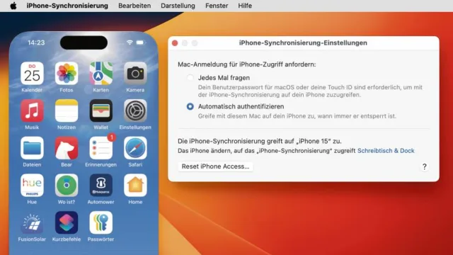 Der Gipfel der Integration wird jedoch mit der brandneuen Funktion iPhone-Synchronsierung erklommen. Sie bedingt, dass mindestens iOS 18 und macOS 15 «Sequoia» installiert sind. Voraussichtlich wird diese Funktion zu Beginn in der Schweiz, aber (noch) nicht in den Ländern der EU freigeschaltet.Mit der iPhone-Synchronsierung wird das iPhone zu einem drahtlosen, integrierten Teil des Macs, indem die gleichnamige Anwendung gestartet wird – und schon erscheint das iPhone als funktionstüchtiger Klon am Mac, während das Gerät noch in der Manteltasche steckt, Bild 7. Das iPhone bleibt dabei verriegelt und für Dritte somit unzugänglich.