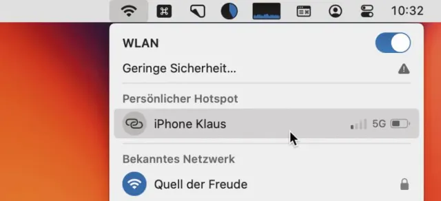 Aktivierung: Tethering ist automatisch verfügbar, wenn die Geräte unter derselben Apple-ID angemeldet sind. Um am Mac auf das iPhone zuzugreifen, klicken Sie in der Menüleiste auf das Wi-Fi-Symbol und wählen das iPhone als Zugang an, Bild 5.