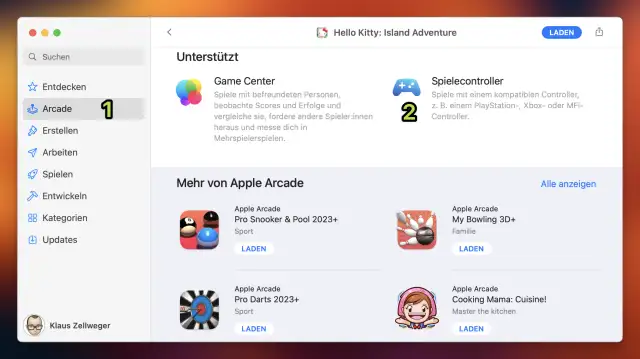 Sie erreichen die Arcade im Mac App Store in der linken Spalte. (1) Je nach Spiel, das Sie anklicken, sehen Sie weit unten den Hinweis, dass Game-Controller unterstützt werden. (2) Aber das kann auch bei anderen Games der Fall sein, die ausserhalb der Arcade angeboten werden.