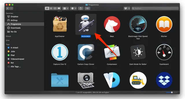 Eine Ordneraktion erstellen Sie mit dem Programm «Automator», das Sie im Ordner «Programme» finden.