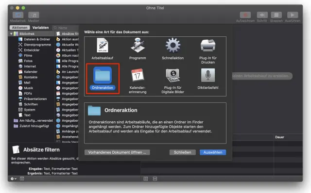 Starten Sie Automator und wählen Sie im Menü «Ablage» den Befehl «Neu». Doppelklicken Sie den Eintrag «Ordneraktion»: