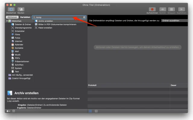 Sie sehen, dass Ihnen Automator zahlreiche Befehle zur Verfügung stellt, um Objekte zu manipulieren. Am einfachsten ist es, wenn Sie den Befehl bereits kennen – dann müssen Sie lediglich im Suchfeld einige Zeichen eintippen: