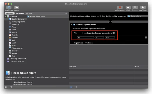 Der Rest ist angenehm-einfach. Um alle neuen Bilder zu verschieben, müssen diese zuerst erkannt werden. Suchen Sie und doppelklicken Sie die Aktion «Finder-Objekt filtern», damit er in die rechte Spalte übernommen wird. Jetzt legen Sie die Kriterien fest. In diesem Fall sollen alle Objekte behandelt werden, die Bilder sind: