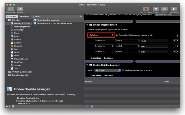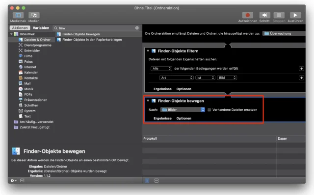 Die nächsten Aktionen beziehen sich deshalb nur auf diese Objekte; der Rest bleibt unangetastet. Um die Bilder in den Ordner «Fotos» zu verschieben, finden und doppelklicken Sie die Aktion «Finder-Objekte» bewegen» und wählen den Zielordner aus: