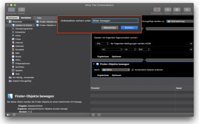 Wenn Sie zufrieden sind, wählen Sie im Menü «Ablage» den Befehl «Sichern» und geben der Ordneraktion eine sinnvolle Bezeichnung: