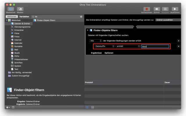 In unserem einfachen Beispiel filtern wir alle Bilddateien. Um auch die Word-Dateien zu filtern, erstellen Sie einfach denselben Ablauf noch einmal: Eröffnen Sie eine neue Ordneraktion, heften Sie diese an den bereits vorhandenen Ordner «Überwachung» und suchen Sie nach Word-Dateien. Dazu könnten Sie nach dem Dateityp «Text» suchen lassen, aber damit werden auch Dateien aus Pages oder TextEdit erfasst. Wenn Sie ausdrücklich die Word-Dokumente filtern möchten, suchen Sie nach der Dateiendung «docx»:
