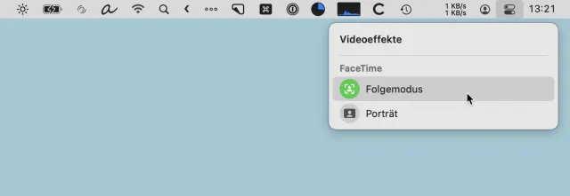 Vielleicht sehen Sie bei sich nur den Porträt-Modus. Bei Geräten mit einem Ultraweitwinkel (wie dem Studio Display) kommt hingegen noch der «Folgemodus» hinzu. Wird im Herbst mit macOS 13 ‹Ventura› ein iPhone verwendet, lässt sich auch das «Studiolicht» einstellen.