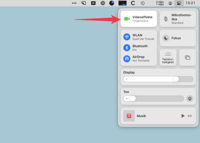 Die Effekte werden ganz einfach aktiviert, indem Sie in der rechten oberen Ecke auf das Kontrollzentrum und danach auf das Symbol Videoeffekte klicken: