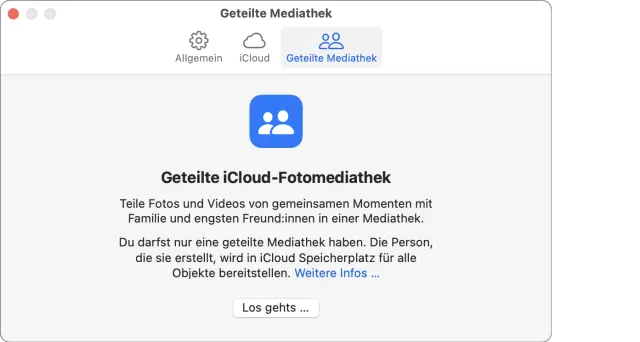 Um loszulegen, öffnen Sie die Einstellungen der Anwendung Fotos am Mac. Im neuen Bereich Geteilte Mediathek klicken Sie auf die Schaltfläche Los gehts und durchlaufen den Assistenten.