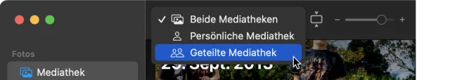 In der Fotos-Anwendung wählen Sie aus dem Einblendmenü oben links, ob Sie nur die private, die geteilte oder beide Mediatheken sehen möchten. In diesem Anwendungsfall wird die geteilte Mediathek wohl die beste Wahl sein.