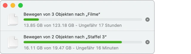Im Finder werden Kopiervorgänge durch einen kleinen Fortschrittsbalken gezeigt. So weit, so bekannt, so bewährt: etwa seit 1984. Doch seit jeher machen diese Balken auch nervös, weil sie stets anzeigen, was noch alles vor uns liegt. Das ist umso lästiger, wenn sich Kopiervorgänge im Netzwerk endlos hinziehen, weil es irgendwo harzt oder die Dateien so furchtbar gross sind – oder beides, so wie in diesem Fall: