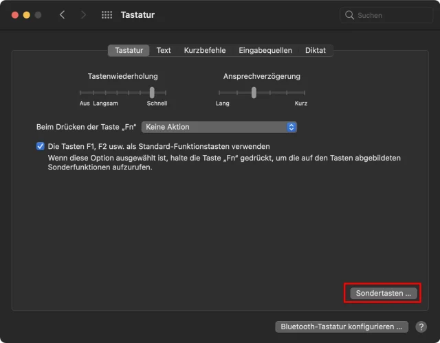 Öffnen Sie die Systemeinstellung Tastatur. Klicken Sie rechts unten auf die Schaltfläche Sondertasten.