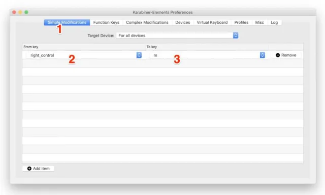 Mit Karabiner ist es möglich, jede einzelne Taste neu zu belegen. Rufen Sie dazu die Einstellungen von Karabiner auf. Wählen Sie den Bereich «Simple Modifications» (1). Anschliessend legen Sie in den Einblendmenüs fest, welche Taste (2) in Zukunft einen anderen Zweck erfüllen soll. (3) In diesem Beispiel verwandelt sich die rechte Control-Taste in die Taste «m», wobei sich über die Sinnhaftigkeit streiten lässt: