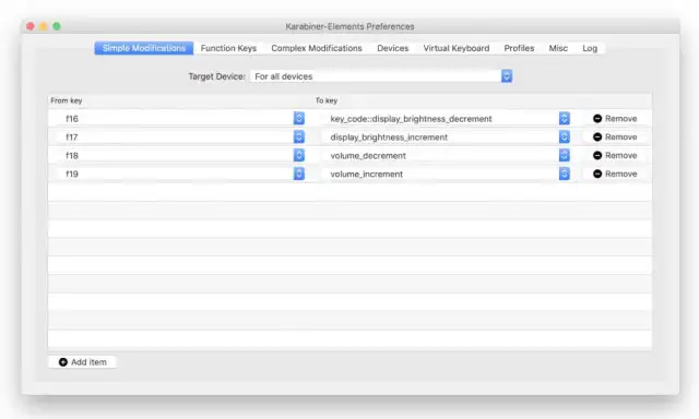 Quelle: Screenshot / zeDeutlich mehr Potenzial offenbart sich, wenn die Tastatur an die eigenen Zwecke angepasst wird. So verwende ich gerne die Tasten F1 bis F12 als reguläre Funktionstasten – und nicht als Tasten zur Medien- oder Helligkeitssteuerung. Um die Helligkeit zu regeln, kommen mit Karabiner die Tasten F16 und F17 zum Zug, für die Lautstärke sind F18 und F19 zuständig: