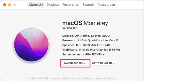 Wählen Sie im Apple-Menü den Befehl Über diesen Mac und klicken Sie auf die Schaltfläche Systembericht: