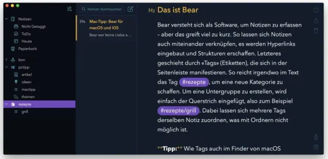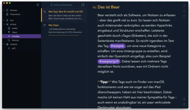 Bear versteht sich als Software, um Notizen zu erfassen – aber das greift viel zu kurz. So lassen sich Notizen auch miteinander verknüpfen, es werden Hyperlinks eingebaut und Strukturen erschaffen. Letzteres geschieht durch «Tags» (Etiketten), die sich in der Seitenleiste manifestieren. So reicht irgendwo im Text das Tag #rezepte, um eine neue Kategorie zu schaffen. Um eine Untergruppe zu erstellen, wird einfach der Querstrich eingefügt, also zum Beispiel #rezepte/grill. Dabei lassen sich mehrere Tags derselben Notiz zuordnen, was mit einer klassischen Ordnerstruktur nicht möglich ist.
