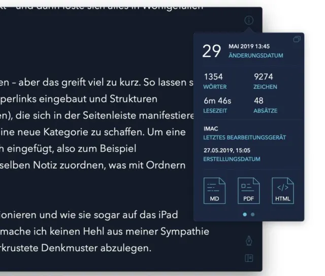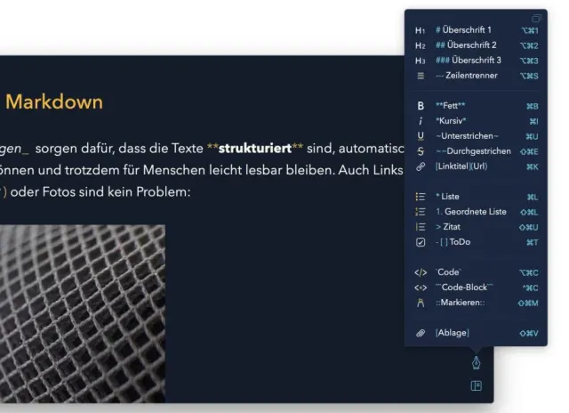 Da ist einerseits die Unterstützung von Markdown zu erwähnen. Für Einsteiger: Bei Markdown handelt es sich um sehr leicht zu erlernende Sprache für die Auszeichnung und Formatierung von Texten. Sie ist für die elektronische Weiterverarbeitung in Programmen oder auf Webseiten konzipiert und bleibt trotzdem so transparent, dass sie von jedem Menschen mühelos gelesen wird. So werden zum Beispiel Passagen, die von **je zwei Sternchen eingefasst werden, fett ausgezeichnet,** während _Unterstriche den Text kursiv darstellen_. Diese Beispiele kratzen nicht einmal an der Oberfläche, aber Wikipedia erzählt Ihnen gerne mehr darüber.