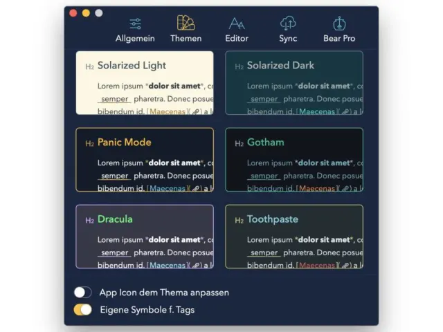 Dieses Wohlgefühl verdankt Bear verschiedenen «Themen», die aus Farbkombinationen für die Texte bestehen. Und es lässt sich nicht leugnen: Diese Farbpaletten machen einen Unterschied! Die Struktur bleibt immer dieselbe, aber die subtilen Farbtupfer sorgen dafür, dass sich das Schreiben fast schon kuschelig-behaglich anfühlt. Dagegen wirkt die Oberfläche des mehrmals erwähnten iA Writer so finster wie eine Kohlengrube.