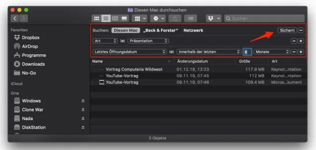 Das Vorgehen ist einfach. Öffnen Sie den Ordner, den Sie durchsuchen möchten. Das kann ein einzelner Projektordner sein, aber auch das komplette Home-Verzeichnis. Wählen Sie im Menü «Ablage» den Befehl «Suchen» und legen Sie die Kriterien fest. Klicken Sie auf die Schaltfläche «Sichern».