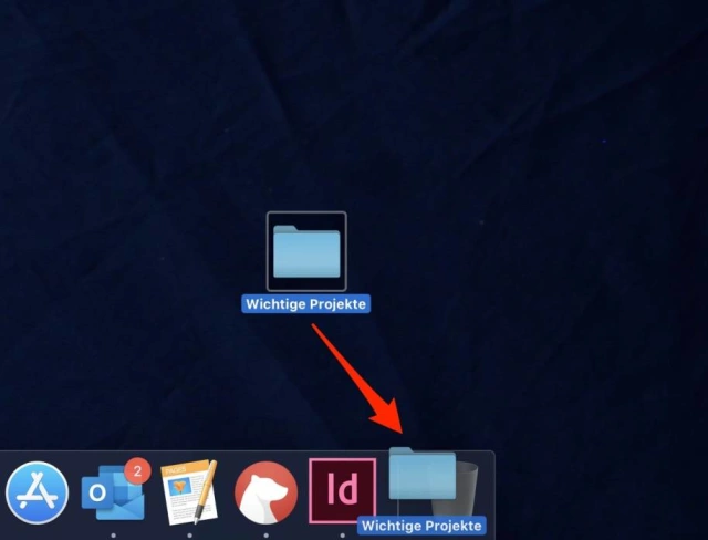 Um einen Ordner zum Dock hinzuzufügen, ziehen sie ihn einfach in das rechte Drittel neben den Papierkorb.