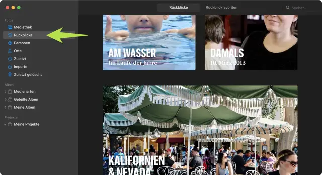 Apples Fotos-Anwendung erstellt regelmässig «Rückblicke», in denen die Bilder und Videos einer bestimmten Zeitspanne oder von einem Ferienort zusammengefasst, überblendet und musikalisch unterlegt werden – ohne dass jemand einen Finger krumm machen muss. Diese Rückblicke tauchen automatisch in der gleichnamigen Kategorie auf. Doppelklicken Sie einen dieser Filme, um ihn anzusehen oder anzupassen: