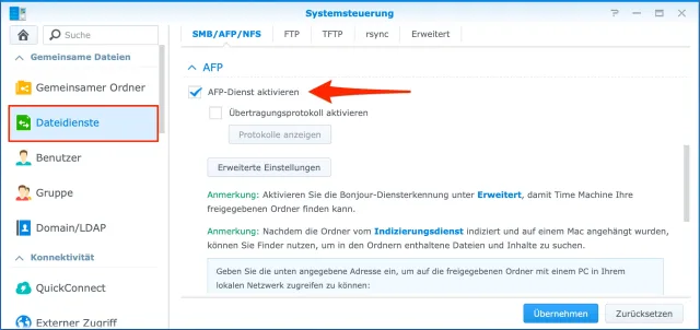 AFP muss im DiskStation Manager aktiviert sein
