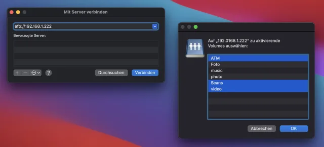 Die gefundene Lösung war sehr einfach. Der Finder versuchte, sich via SMB mit der DiskStation zu verbinden, im Screenshot oben zu erkennen am Adressformat «smb://». Und das funktioniert leider nicht. Wird hingegen auf Apples eigenes AFP-Protokoll ausgewichen, klappt die Verbindung auf Anhieb. In meinem Fall lautet die Adressierung «afp://192.168.1.222», gefolgt von einem Klick auf die Schaltfläche «Verbinden». Danach wird das gewünschte Volume ausgewählt, mit gedrückter Command-Taste gerne auch mehrere.