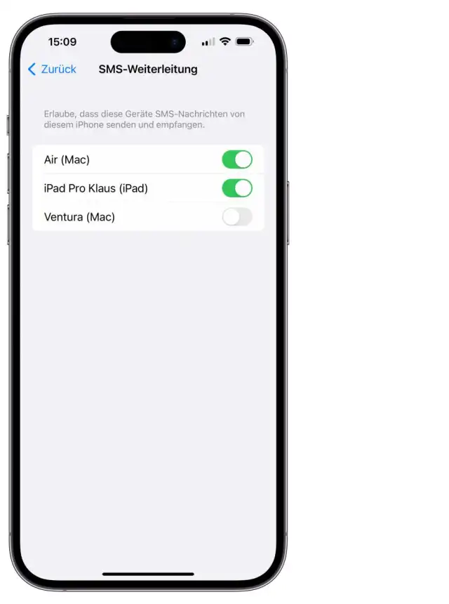 Noch besser wird es allerdings, wenn auch Nicht-iPhones in den Genuss dieser Möglichkeiten kommen, also der Mac und das iPad. Um diese Funktion zu aktivieren, öffnen Sie die Einstellungen des iPhones und navigieren zu Nachrichten › SMS-Weiterleitung. Dort legen Sie fest, welche Geräte diese Komfortfunktion in Anspruch nehmen dürfen.