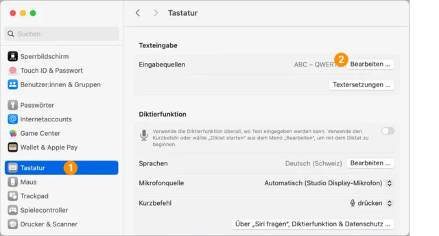 Um die Belegung kennenzulernen, öffnen Sie die Systemeinstellung Tastatur und klicken unter Eingabequellen auf die Schaltfläche Bearbeiten: