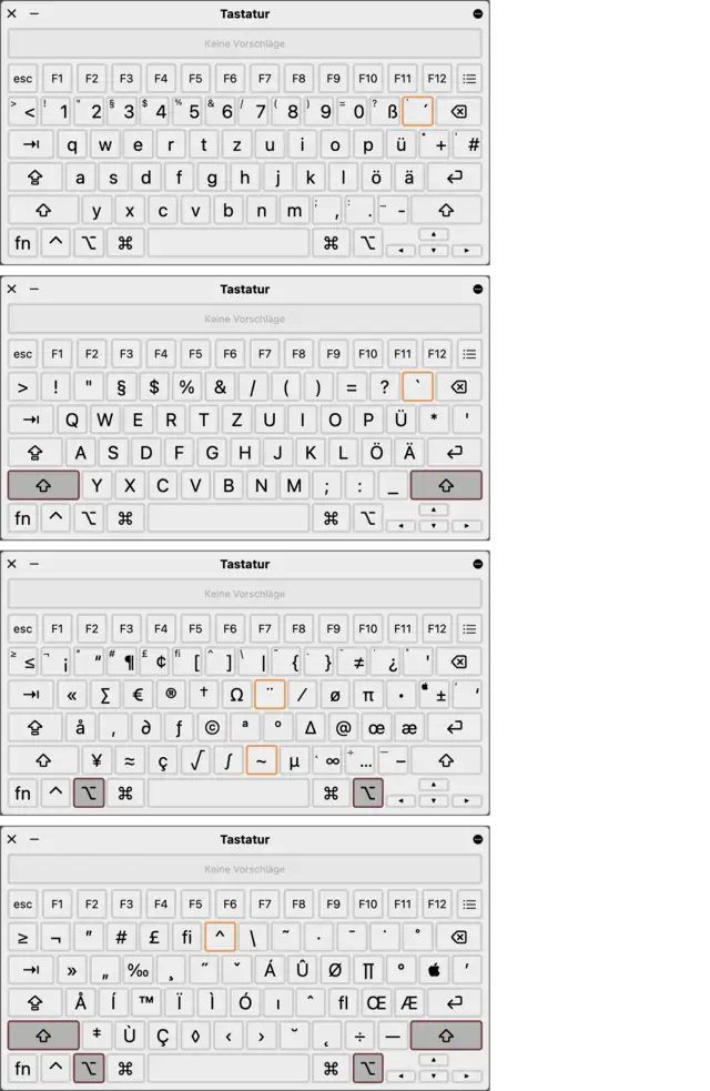 Im Gegensatz zu anderen Betriebssystemen ist es unter macOS ein Leichtes, in allen Programmen direkt an die wichtigsten Sonderzeichen zu kommen – etwa an das ©- oder das ‰-Zeichen. Insgesamt kennt macOS vier Ebenen für Schriftzeichen: keine Modifikationstaste (also Kleinbuchstaben), Shift-Taste, Option-Taste sowie Shift+Option-Tasten.