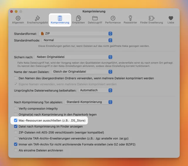 Die Software Keka weiss das zu verhindern: Dazu öffnen Sie in den Einstellungen den Bereich Komprimierung und aktivieren die Option Mac-Ressourcen ausschliessen (z. B.: .DS_Store). Das gilt anschliessend für alle neuen Archive, die Sie mit Keka erstellen.