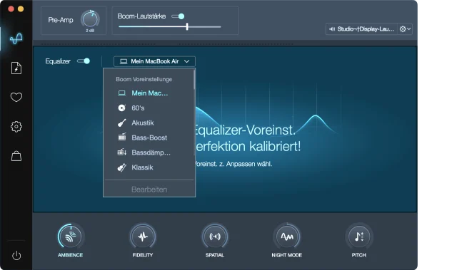 Das mit den Lautsprechern geht noch besser, zum Beispiel durch die Verwendung von Boom 2, zu haben im Mac App Store. Die Software agiert als Equalizer und holt nach einer kurzen, automatischen Kalibrierung tatsächlich mehr aus den Lautsprechern – sowohl denjenigen des MacBook Air als auch aus jenen im Studio Display. Wenn Sie keine Abos mögen, kostet eine einmalige Lizenz 39 Franken. Das klingt nach viel; die Software kann aber gerade bei Werbern eine Menge bewirken, wenn sie ihr multimediales Werk den Kunden vor Ort präsentieren.