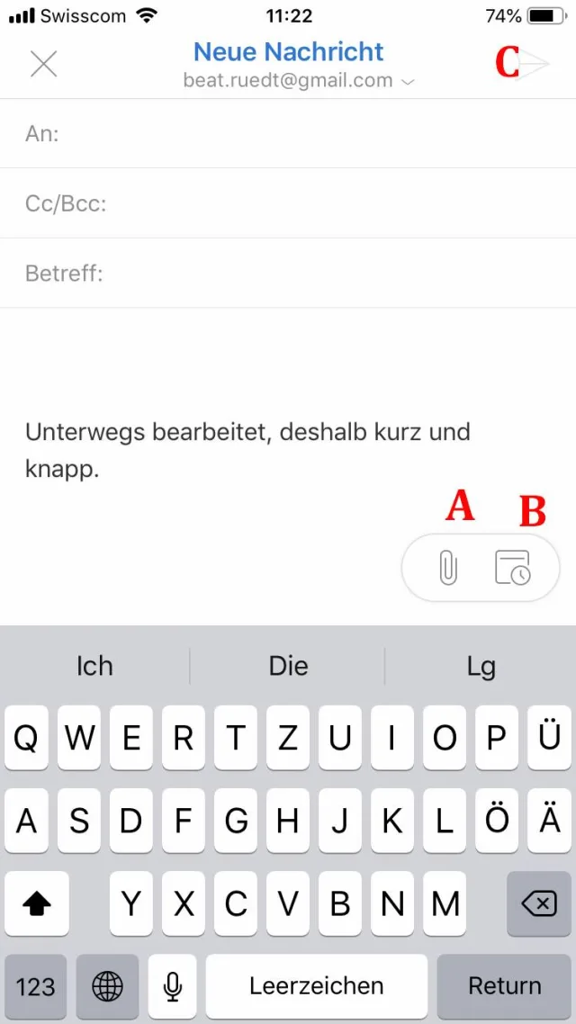Alternativ haben Sie auch Zugriff auf Ihre Kamera oder die auf dem Smartphone gespeicherten Bilder. Mit einem Klick aufs Kalender-Symbol, Bild 4 A, teilen Sie Ihre «Verfügbarkeit» mit oder wandeln die E-Mail in ein Ereignis um. Nach Antippen des Papierflieger-Symbols oben rechts (B) wird die E-Mail versendet.
