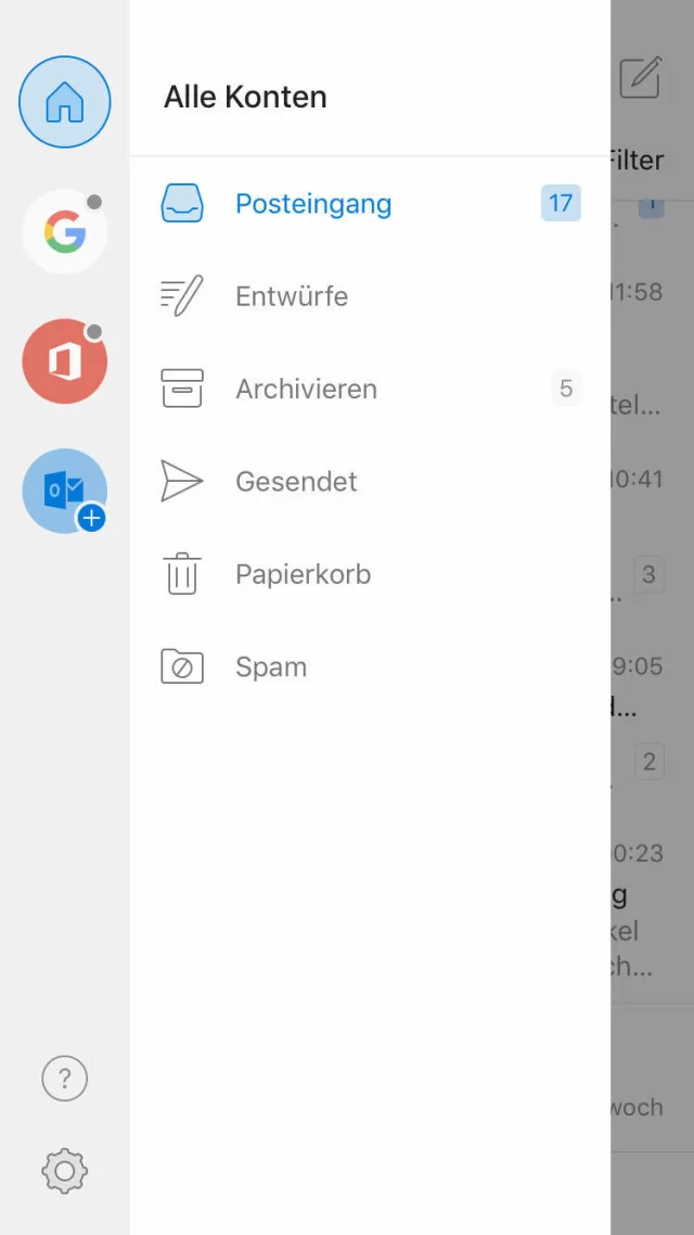 Outlook für Smartphones ist – genauso wie die Desktop-Version – darauf ausgerichtet, mit mehreren E-Mail-Konten zu arbeiten. Wenn Sie eines hinzufügen möchten, gehen Sie in die Einstellungen (Zahnrad-Symbol) und tippen auf Konto hinzufügen.