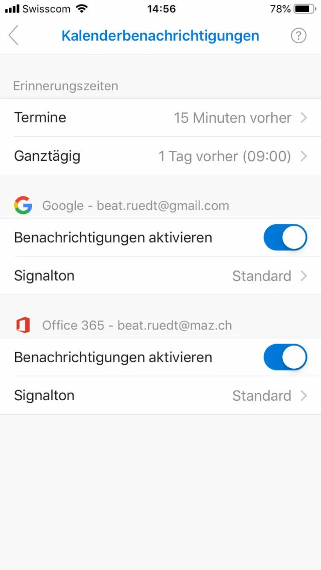 Quelle: PCtippOb Sie über anstehende Termine benachrichtigt werden und wie, legen Sie per Benachrichtigungen (Bild 8, H) fest. Hier definieren Sie auch, mit welchem Zeitvorlauf die Erinnerung kommt, Bild 10, wobei die Einstellung für ganztägige Termine separat gemacht wird.