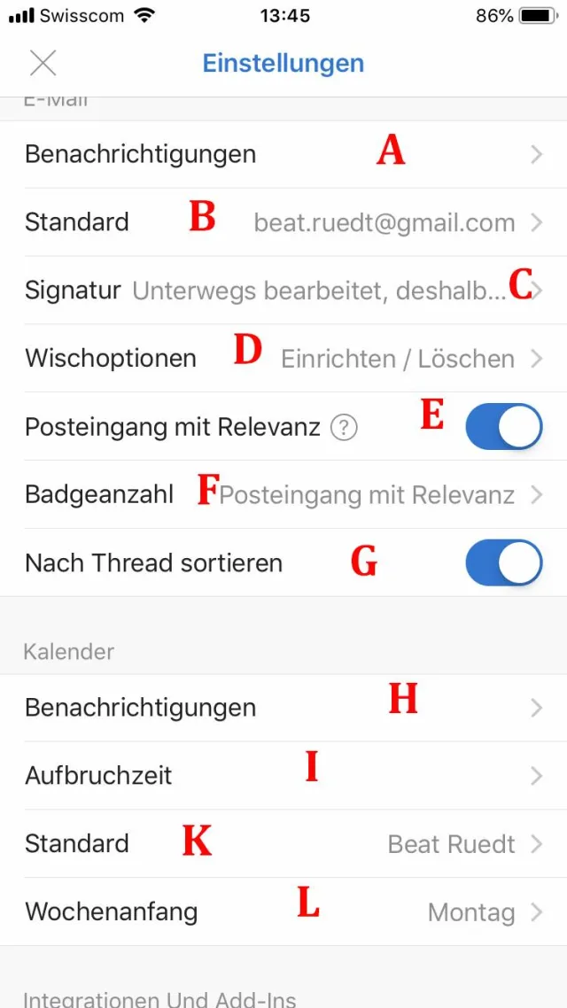Etwas, was Sie sicher gern ändern möchten, ist die Signatur (C); sie lautet standardmässig «Outlook für iOS» herunterladen oder «Outlook für Android herunterladen». Tippen Sie auf den Eintrag, um eine eigene Signatur zu erfassen.