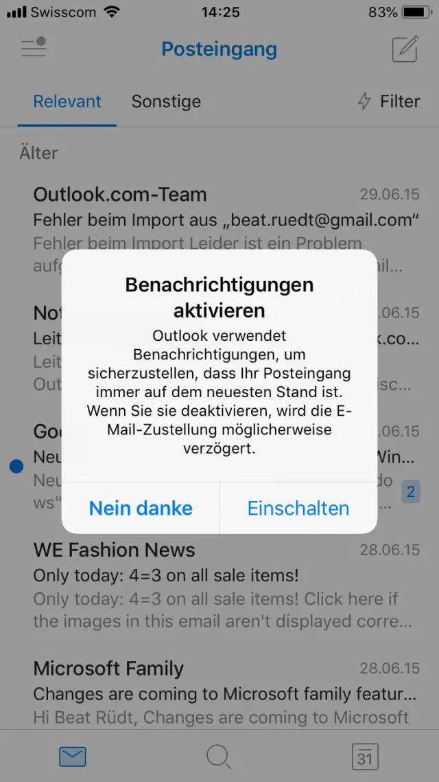 Klicken Sie auf Nein danke, falls Sie das nicht möchten, ansonsten auf Einschalten. Im Folgenden müssen Sie das Senden von Mitteilungen Erlauben oder Nicht erlauben. Nach diesen Abfragen landen Sie im Posteingang und die ersten Nachrichten werden heruntergeladen.