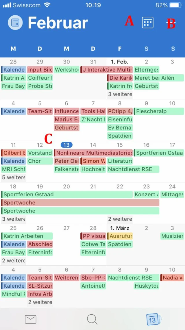 Quelle: PCtippDurch Antippen des Kalender-Symbols unten im Hauptfenster gelangen Sie in die Kalenderansicht. Oben rechts wird ein zweites Kalender-Symbol angezeigt, Bild 5 A. Wenn Sie es antippen, haben Sie die Auswahl zwischen Agenda-Ansicht (die nächsten Termine), Tag, 3 Tage und Monat. Um einen neuen Termin zu erstellen, tippen Sie aufs Plus-Symbol (B).