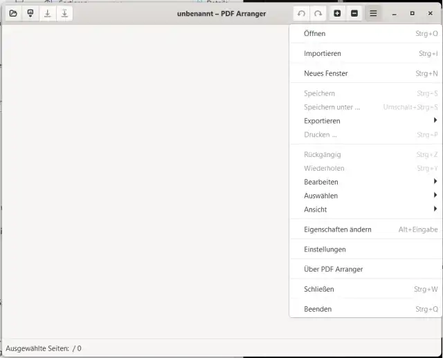 Starten Sie den PDF Arranger und bestaunen Sie seine minimalistische Bedienoberfläche. Das einzige Menü, das Sie finden, ist oben rechts das ☰-Menü, in dem Sie die wichtigsten Befehle und ein paar wenige Einstellungen entdecken.