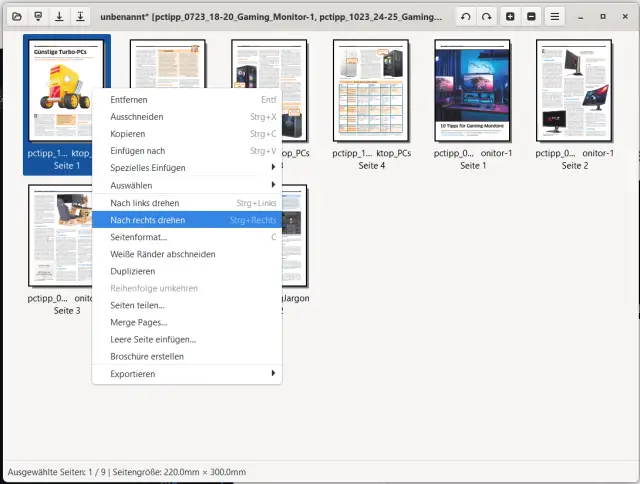 Quelle: PCtipp.chFürs Behandeln von PDFs benötigen Sie das Menü jedoch meist gar nicht. Ziehen Sie die PDFs einfach per Maus ins Fenster. Möchten Sie eine Seite verschieben, etwa von der Mitte ans Ende, erledigen Sie dies einfach per Maus per Drag & Drop. Sollen es gleich mehrere sein, markieren Sie diese mit Shift (wenn diese nebeneinander sind) oder mit Ctrl (wenn Sie einzelne herauspicken wollen). Der Rechtsklick bietet auch ein Entfernen von Seiten oder ein Hinzufügen von Leerseiten. Zum Schluss gehts oben zu Speichern.