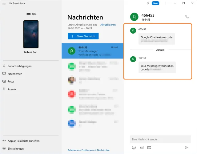 Die App erlaubt es, am PC auf Benachrichtigungen vom gekoppelten Android-Smartphone zuzugreifen, per Smartphone geknipste Bilder anzuschauen (Aufgepasst: Lesen Sie «Windows 10 hat meine Bilder geschrumpft!») und, was besonders nützlich ist, auch das direkte Empfangen, Verfassen und Versenden von SMS, bequem per PC-Tastatur.
