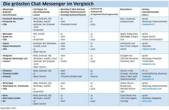 Die grössten Chat-Messenger im Vergleich (Stand: März 2021)