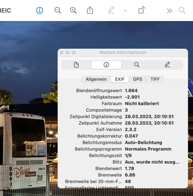Zu den Exif-Daten gehören unter anderem das Aufnahmedatum, aber auch Informationen zur Kamera, zum Objektiv und natürlich GPS-Koordinaten, die den Aufnahmeort speichern. Diese Daten lassen sich einsehen, indem ein Bild zum Beispiel in Apples Vorschau geöffnet wird. Wählen Sie im Menü Werkzeuge den Befehl Informationen einblenden – und schon sehen Sie alles, was es über die Aufnahme zu sagen gibt, Bild 1.