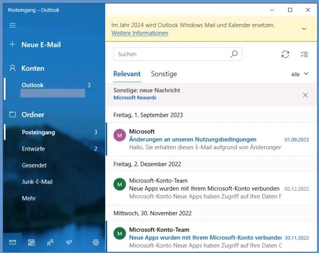 Die in Windows 10 und 11 vorinstallierte App «Mail» wird nächstes Jahr eingestellt. Darauf macht die App in letzter Zeit selbst aufmerksam. Als Ersatz wird eine kostenlose Version von Outlook angepriesen, die übrigens, sofern Sie kein kostenpflichtiges Microsoft-Konto benutzen, Werbung anzeigen wird. Ausserdem flunkert Microsoft ein wenig, wenn das Unternehmen behauptet, das neue Outlook könne IMAP.