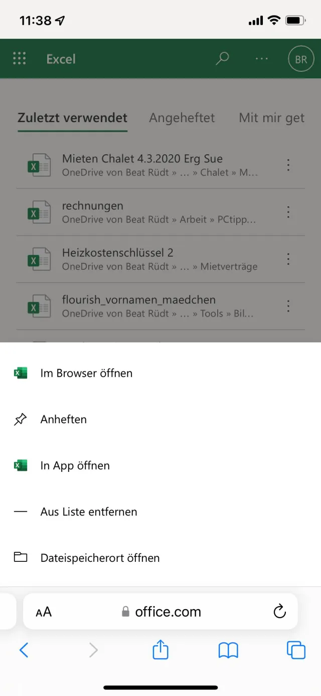 Hier wählen Sie wie gewohnt das Office-Programm aus, das Sie nutzen möchten. Anschliessend sehen Sie die Liste mit den zuletzt bearbeiteten Dateien, Bild 12. Tippen Sie die gewünschte Datei an, so haben Sie die Wahl zwischen den Optionen Im Browser öffnen und In der App öffnen.